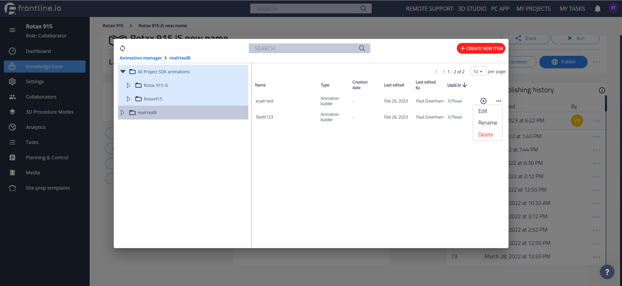 Right-clicking on a folder allows you to rename or delete it. Note that deleting a folder will also delete its children (folders and animations).