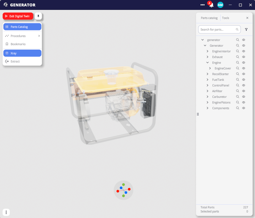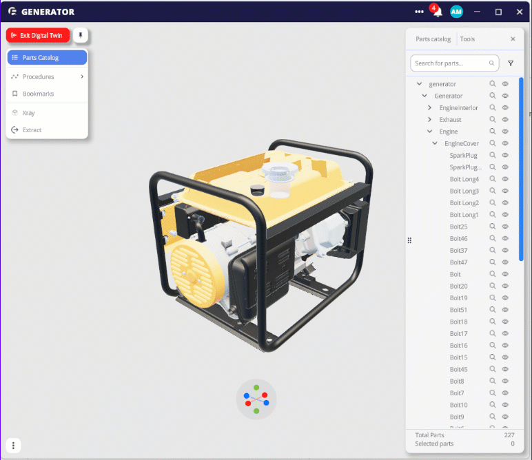 Within the menu are several default interaction options, the Parts Catalog, Procedures, Bookmarks, X-Ray, and Extract. Additional menu functions can be added and configured through the Digital Twin Editor or by using the 3D Studio SDK, allowing for customized interactions specific to your project.