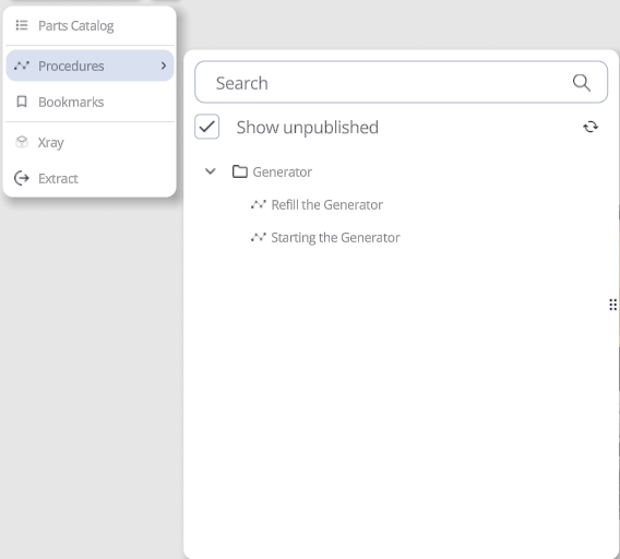 The Procedures option in the Digital Twin Viewer menu allows a seamless transition from viewing the Digital Twin to accessing its associated procedures. Selecting the Procedures button in the side menu opens a drop-down list within the scene, where all available procedures linked to the Digital Twin can be accessed and loaded directly.